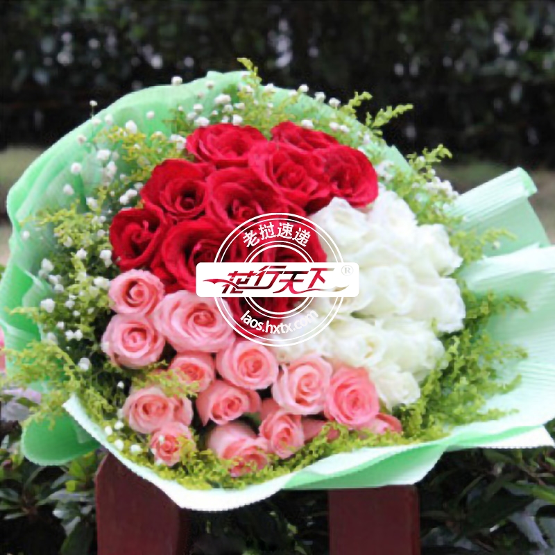 红玫瑰、粉玫瑰、白玫瑰混合共计33枝、精美包装.