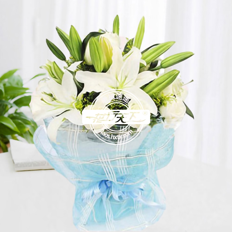 描述: 9枝白玫瑰、6朵白百合、精美包装。
